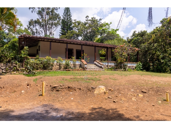 La casa principal es una construcción tradicional, amplia, con patio central y corredores, típica de las fincas antiguas de la región. Tiene espacios generosos que se pueden mantener como están o actualizar según el gusto. A su alrededor se encuentra un área adicional que puede funcionar como apartamento independiente o zona de servicio.